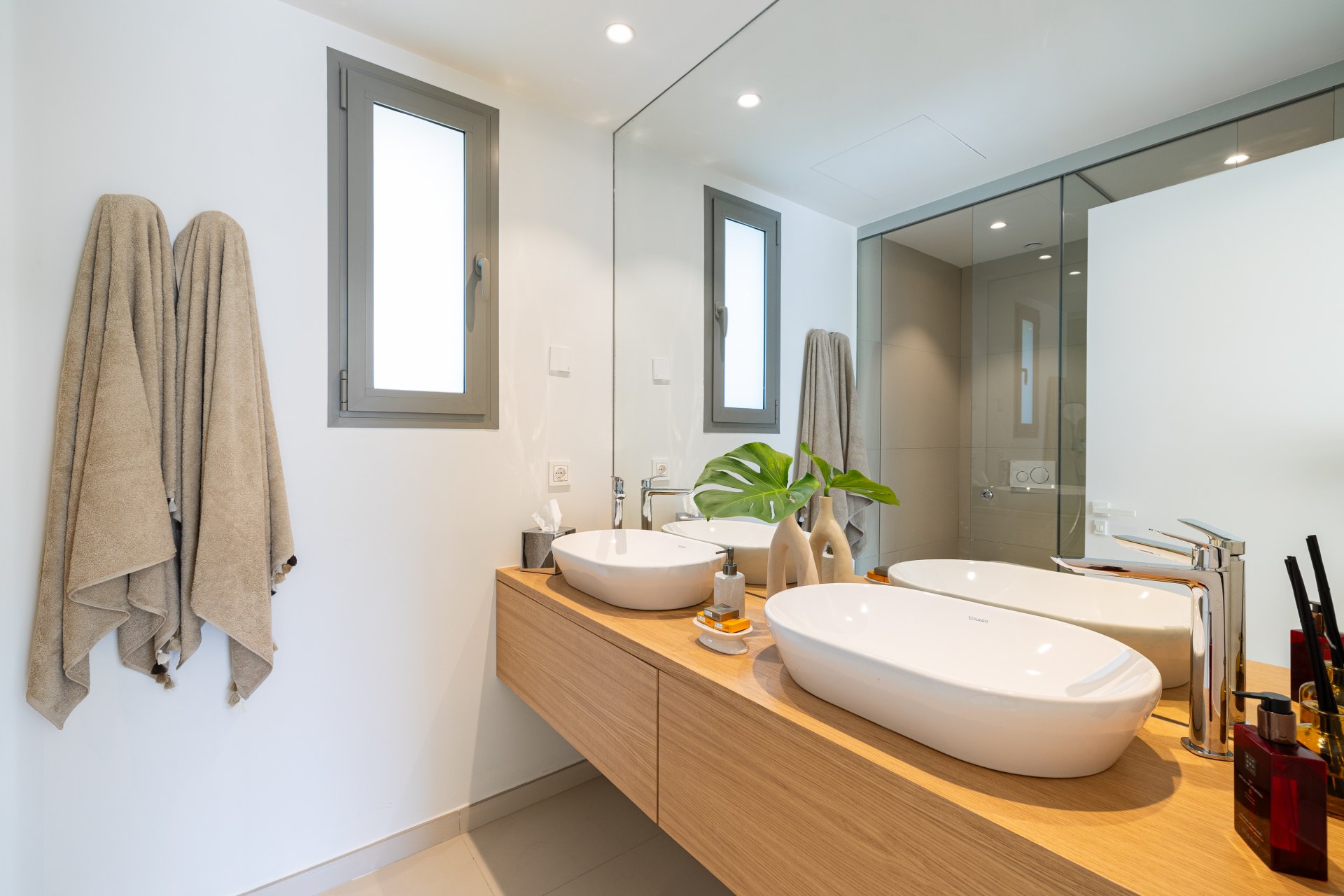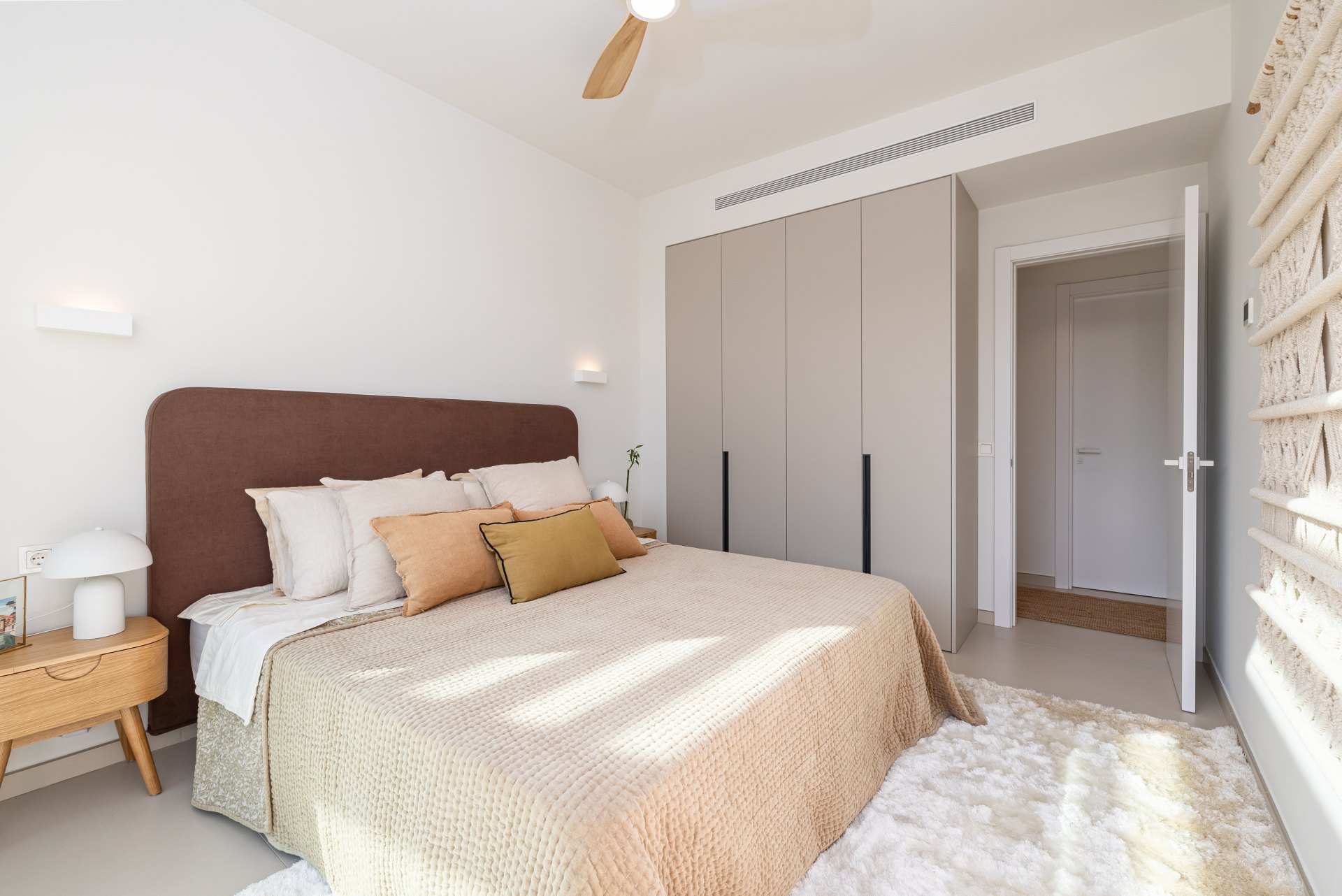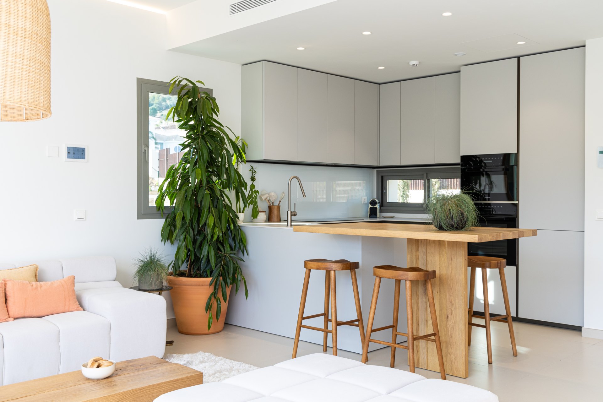 The interiors of this development stand out for their exceptional quality, featuring Saloni ceramic flooring, kitchens equipped with Bosch and AEG appliances, and underfloor heating. Home automation provides comfort and control, while the bathrooms showcase luxury finishes from brands such as Kaldewei, Duravit, and Hansgrohe. The large windows fill the spaces with natural light, enhancing the neutral and warm tones that create a cosy and elegant atmosphere.