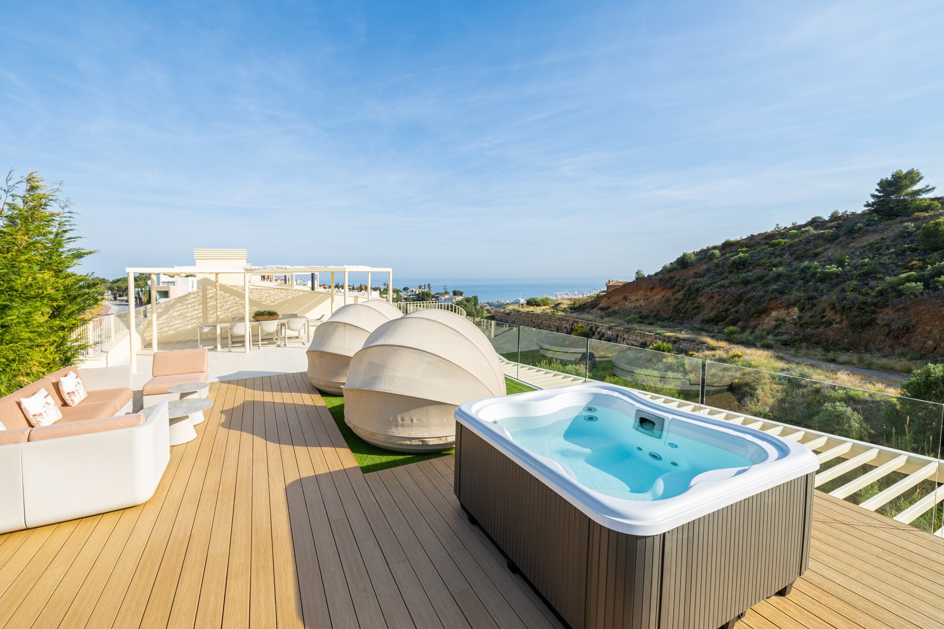 Located in an exclusive area of the Costa del Sol, this property boasts a prime location just 20 minutes from the airport and Málaga city centre, and only a few minutes from the sea. The homes are characterized by their brightness, featuring large terraces and solariums that offer spectacular views of the sea and mountains. With 16 linear meters of façade, each home opens to its surroundings while maintaining privacy. All rooms enjoy terraces bathed in natural light, with a southwest orientation to maximize sun exposure throughout the day.