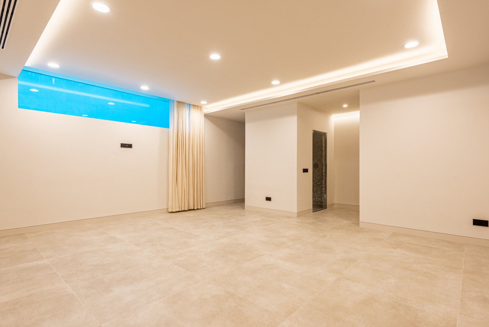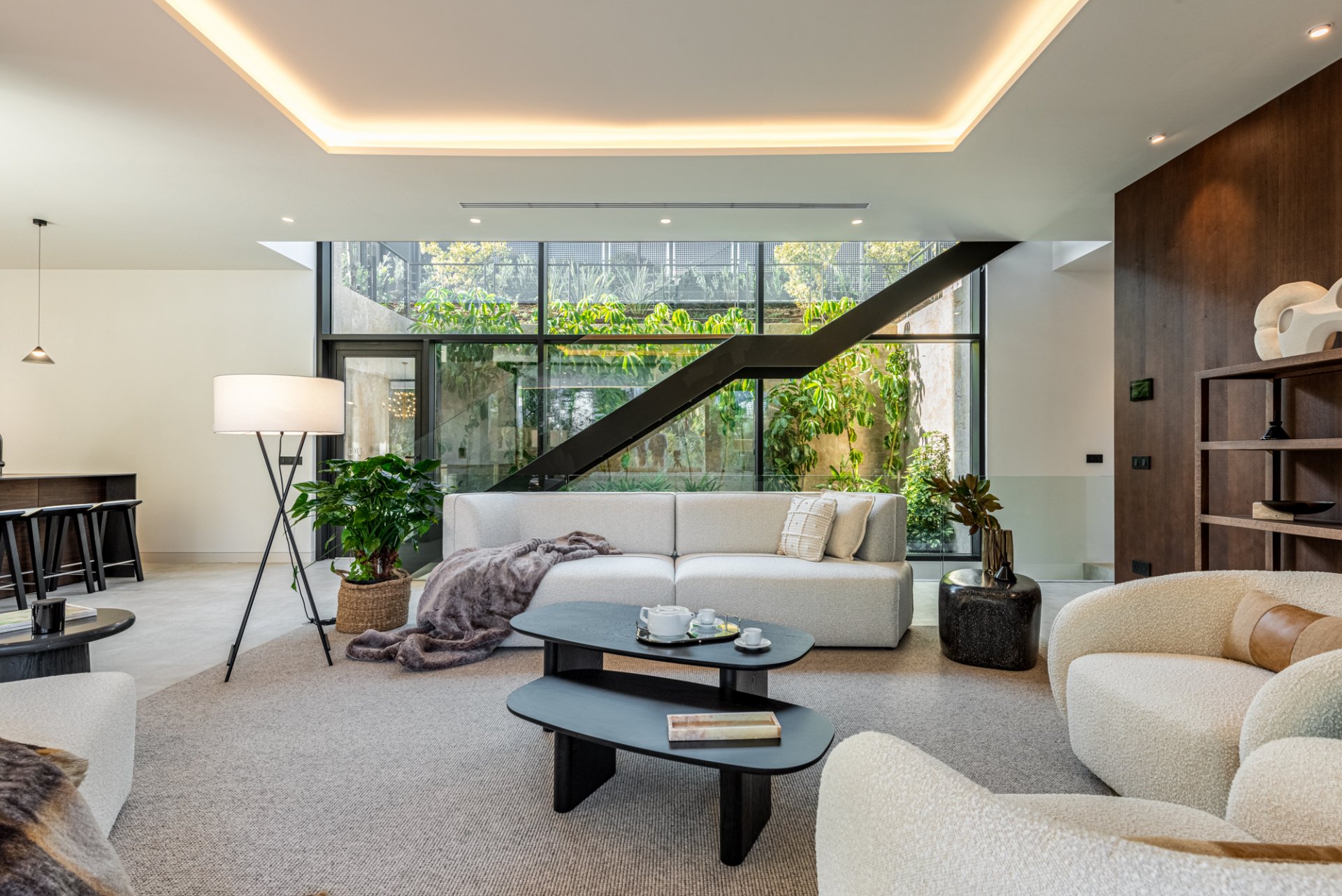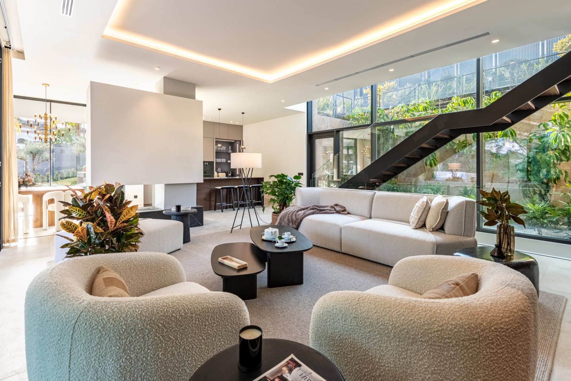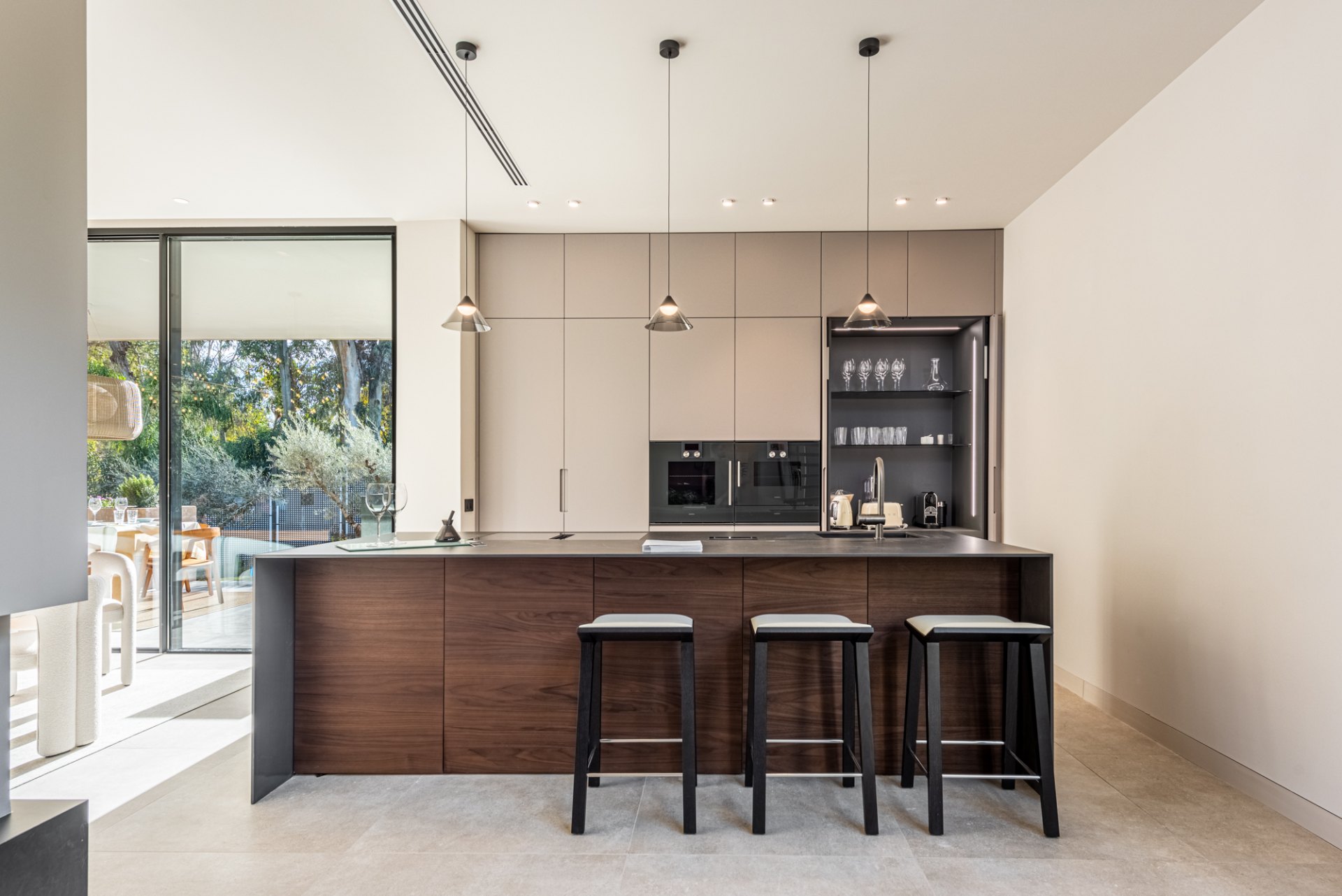 The interiors are furnished with soft natural elements in perfect harmony with each other. Floor-to-ceiling windows allow plenty of light. Distributed on 4 different levels, this beautiful villa has plenty of space for family and friends, offering 5 bedrooms all ensuite. You will also meet your wildest dreams in terms of luxury details with a Gym, SPA, Steam Room, Sauna, office room and a Solarium with kitchenette and sitting area.