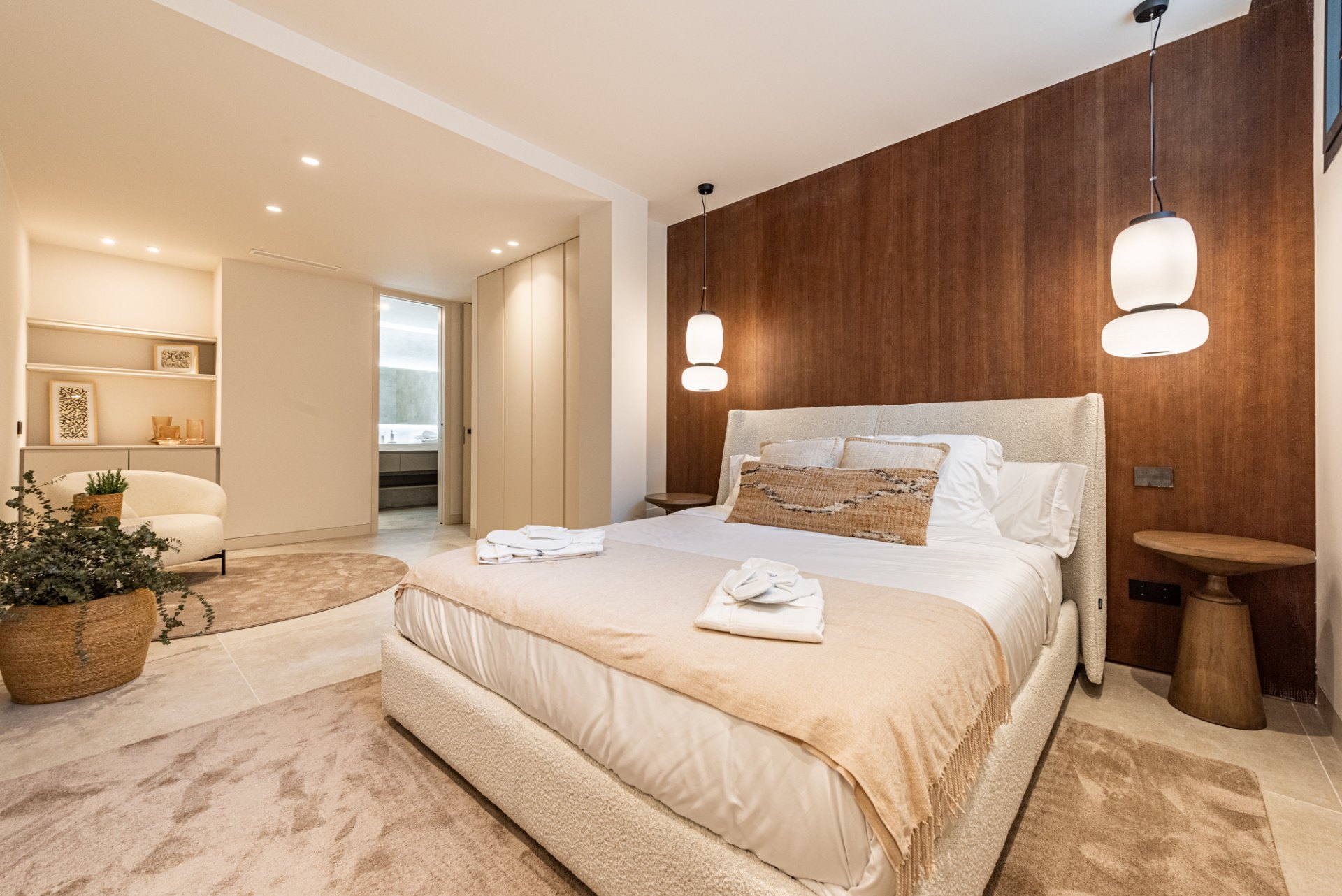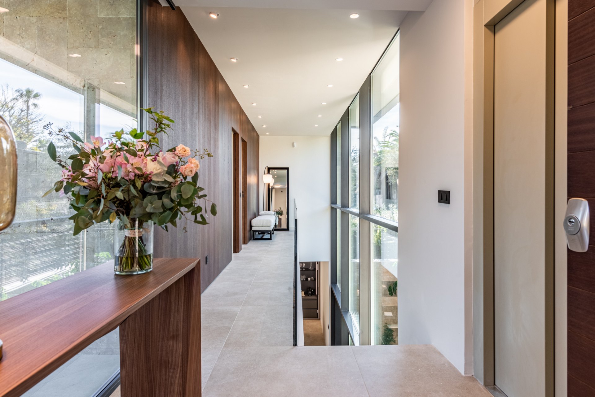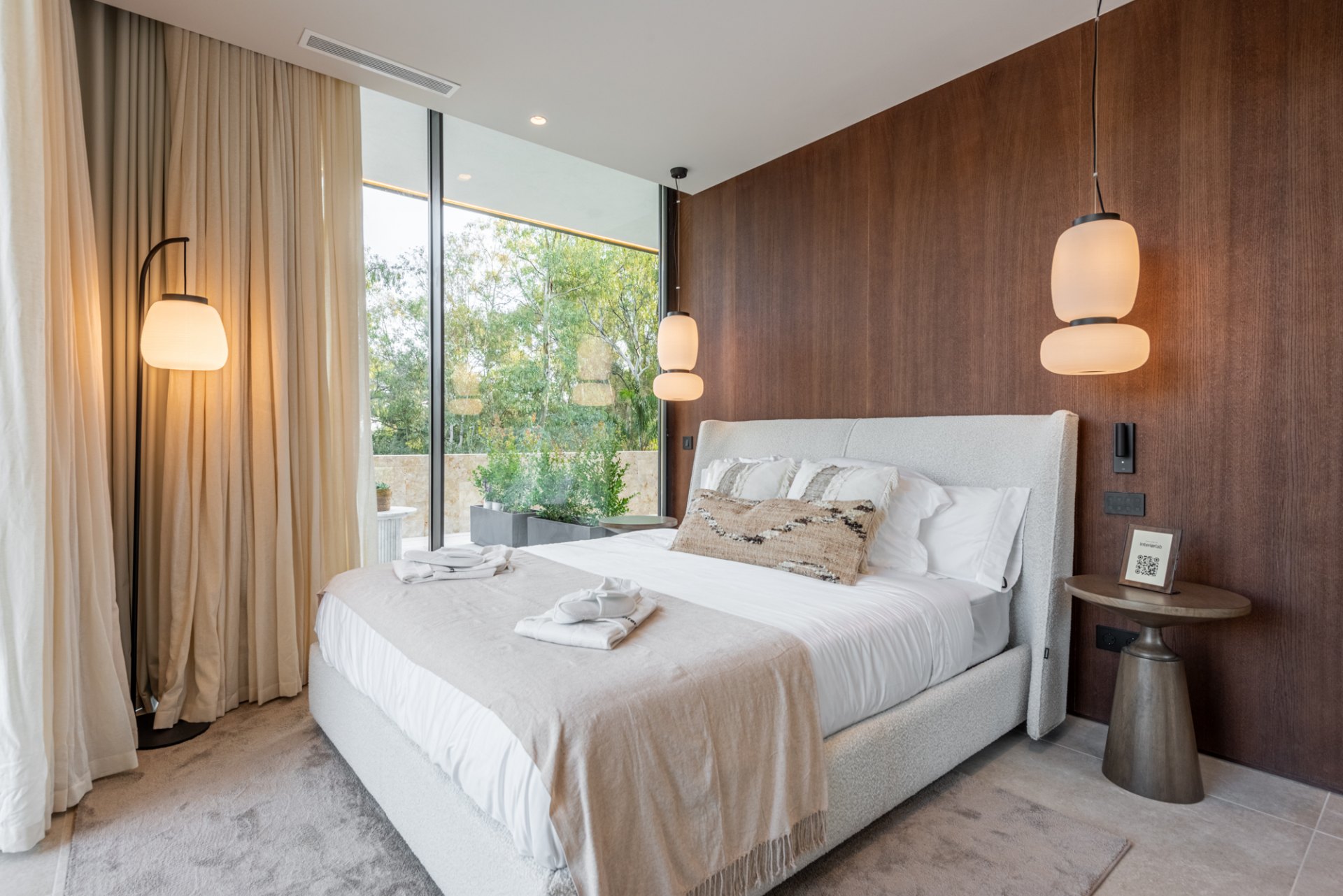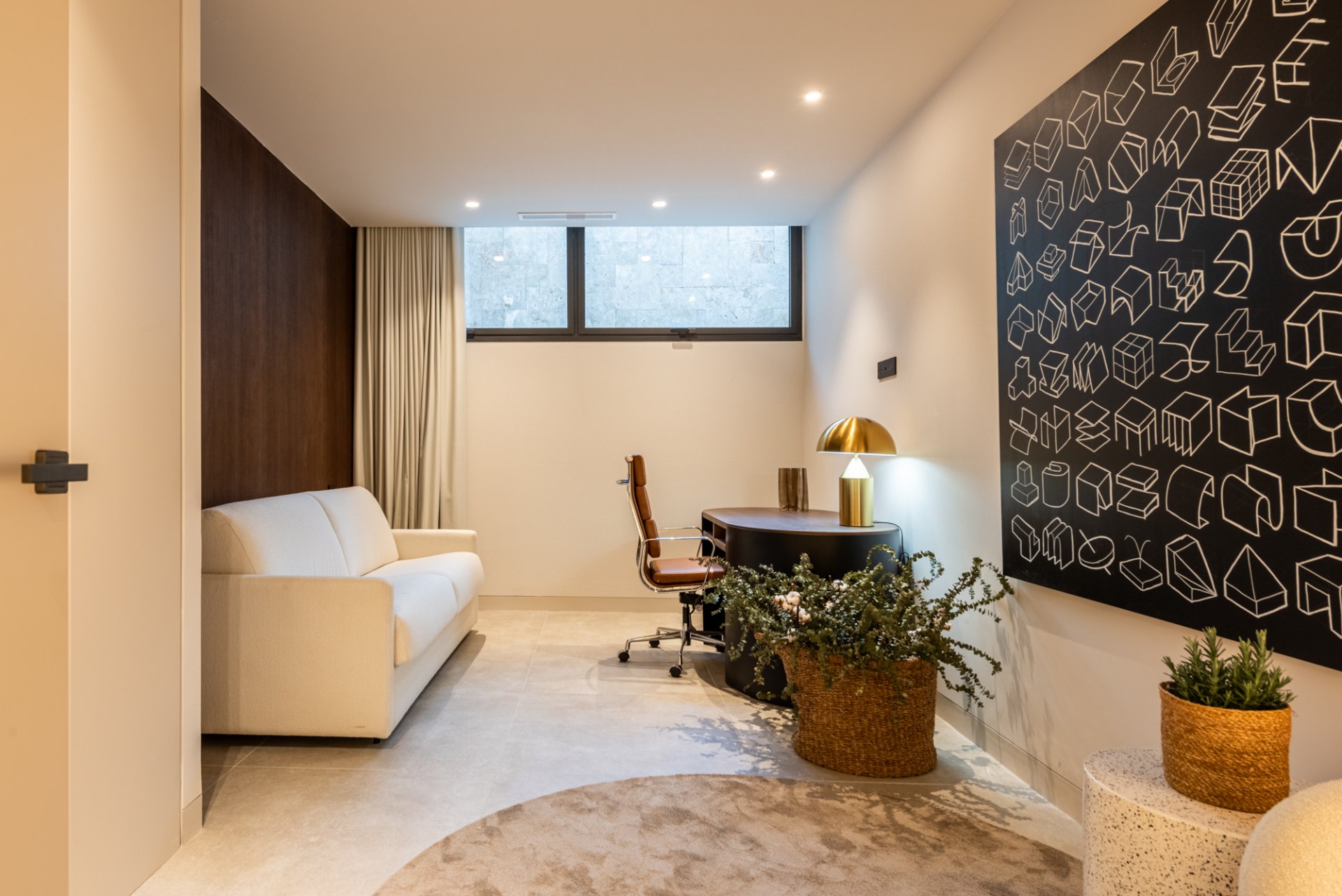The interiors are furnished with soft natural elements in perfect harmony with each other. Floor-to-ceiling windows allow plenty of light. Distributed on 4 different levels, this beautiful villa has plenty of space for family and friends, offering 5 bedrooms all ensuite. You will also meet your wildest dreams in terms of luxury details with a Gym, SPA, Steam Room, Sauna, office room and a Solarium with kitchenette and sitting area.