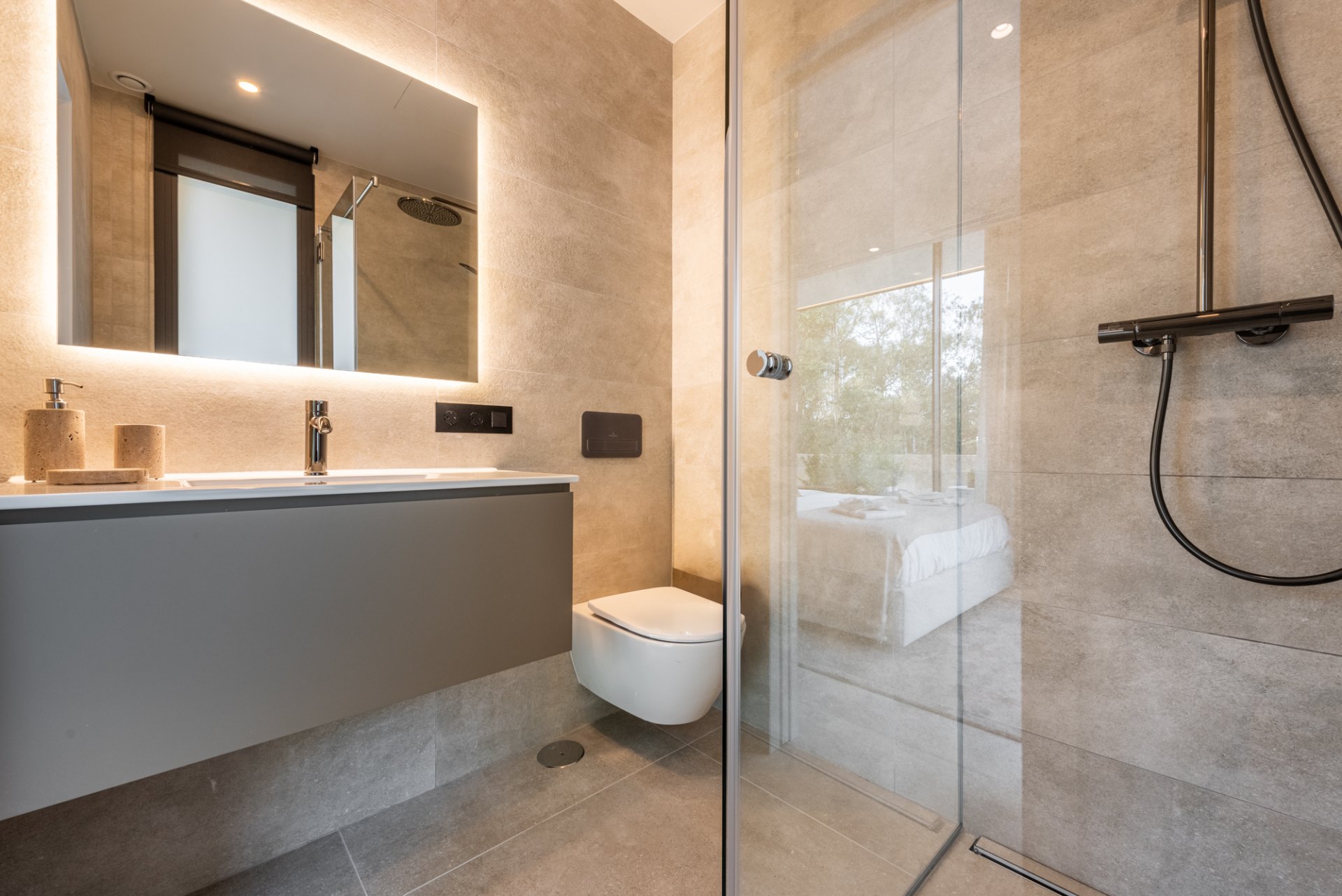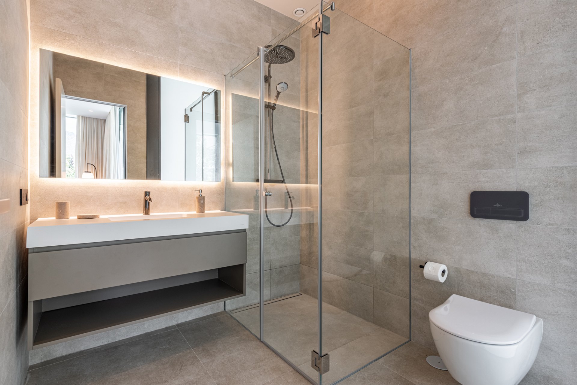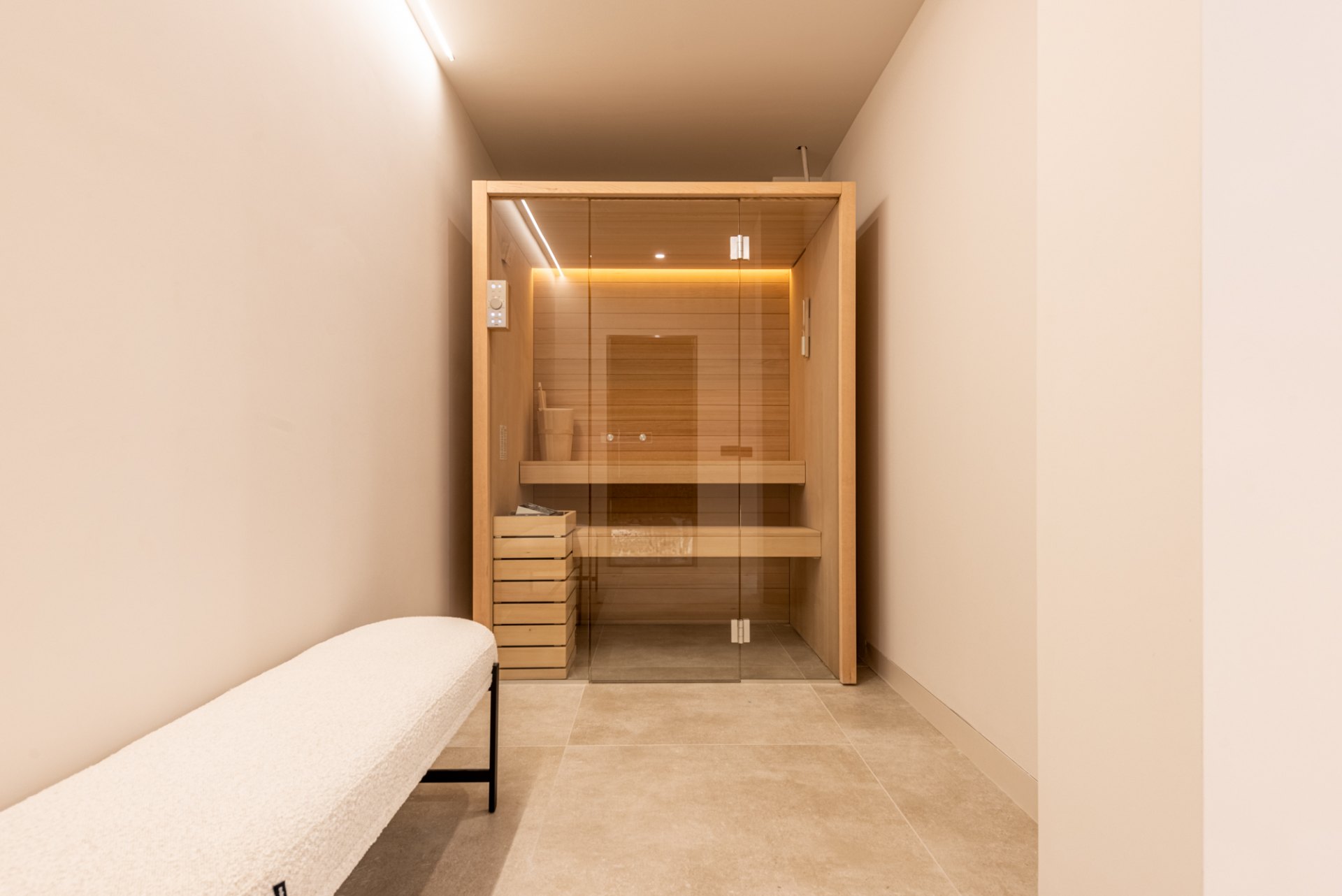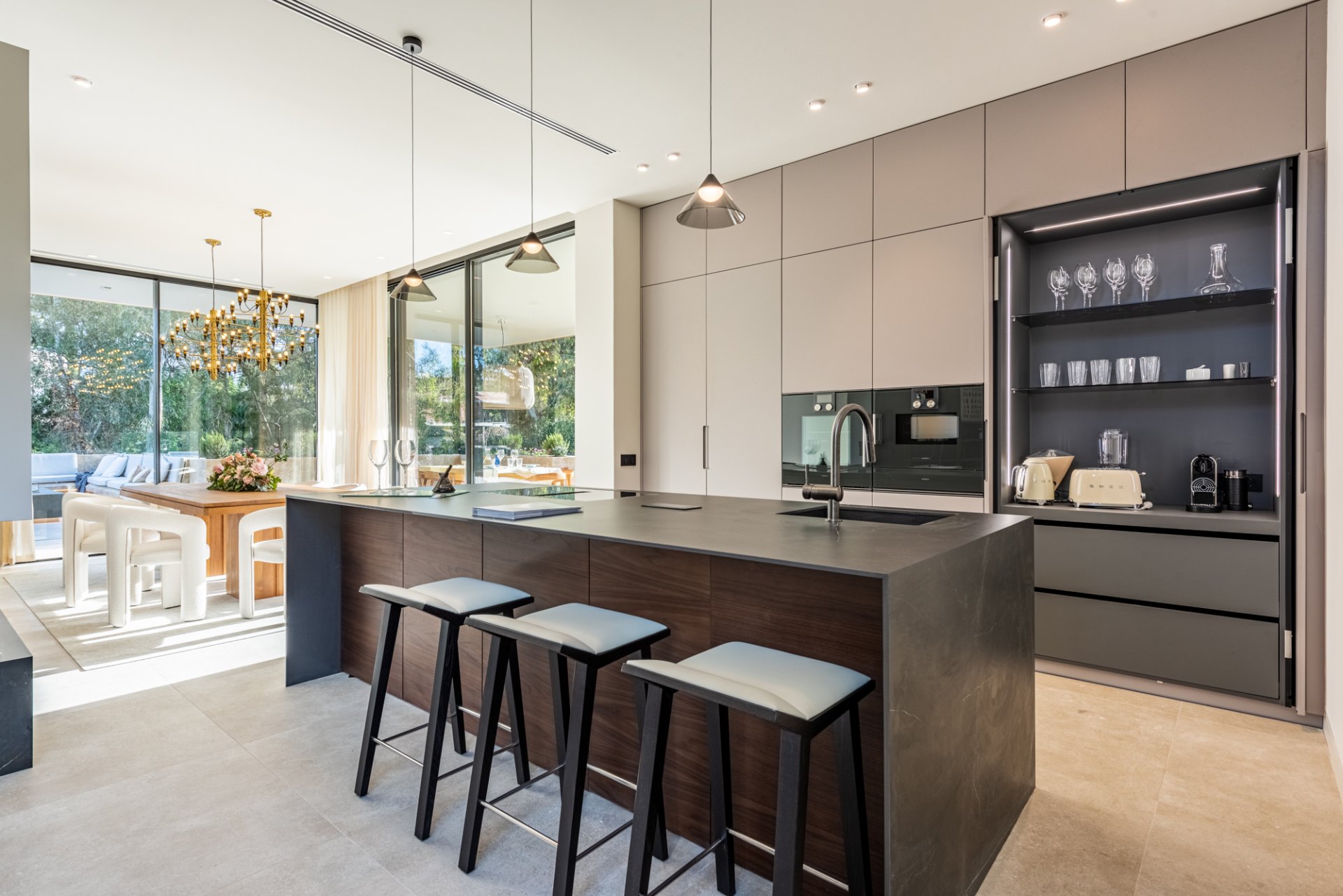 The interiors are furnished with soft natural elements in perfect harmony with each other. Floor-to-ceiling windows allow plenty of light. Distributed on 4 different levels, this beautiful villa has plenty of space for family and friends, offering 5 bedrooms all ensuite. You will also meet your wildest dreams in terms of luxury details with a Gym, SPA, Steam Room, Sauna, office room and a Solarium with kitchenette and sitting area.